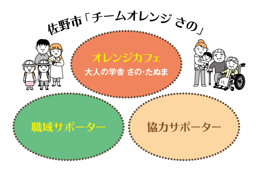 チームオレンジとは、認知症の本人や家族、そして行政、地域住民等が「支援する人、される人」の関係を超えて、 ともに活動し、誰もが安心して自分らしい生活を送れる地域づくりを行うための取組として、政策として実施されています。佐野市は、全国的に先駆けて取り組んでいます。